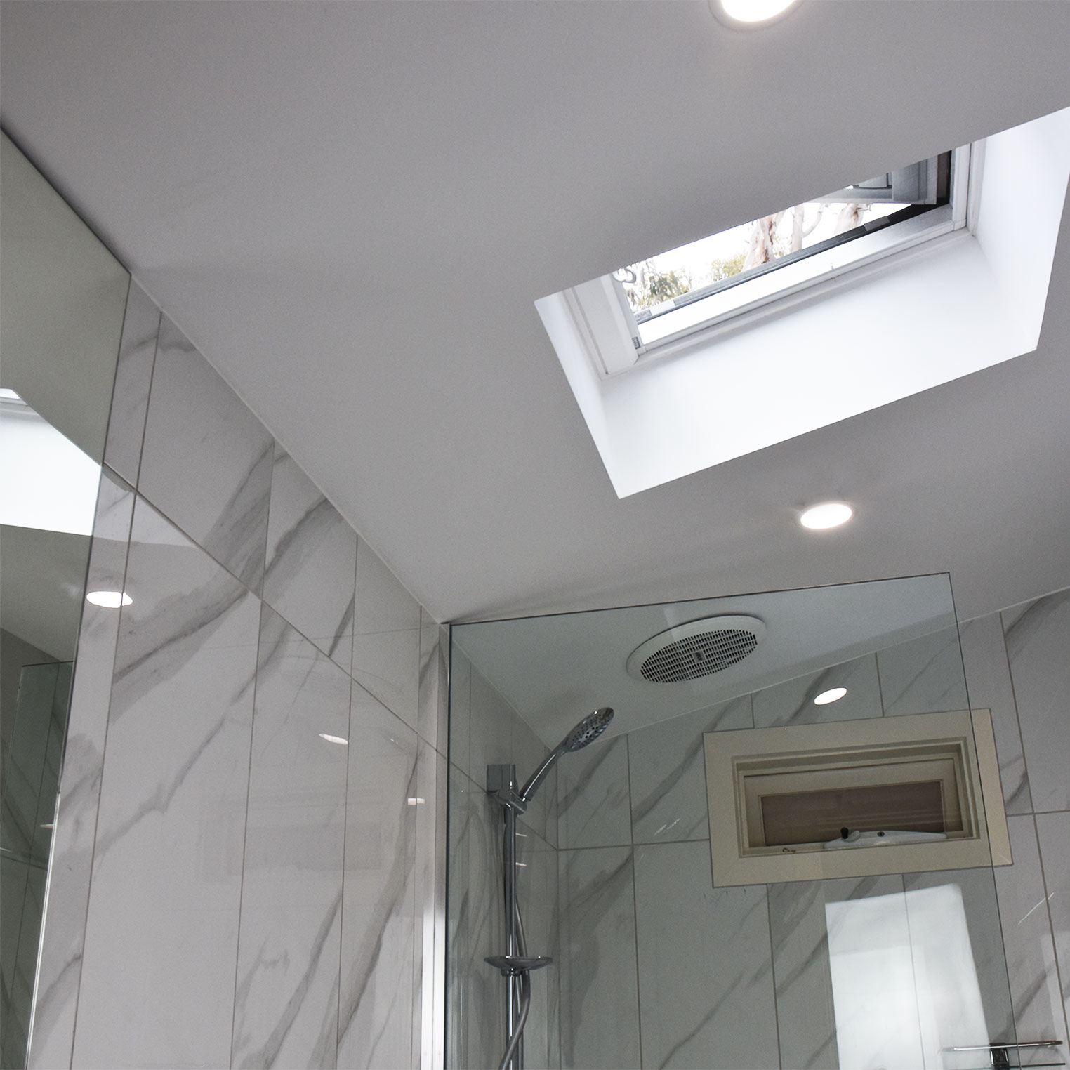 The renovation features a spacious walk-in shower with frameless glass, modern chrome shower fittings and large marble-style wall tiles that create a clean and contemporary look. The new layout maximises available space while improving everyday usability.